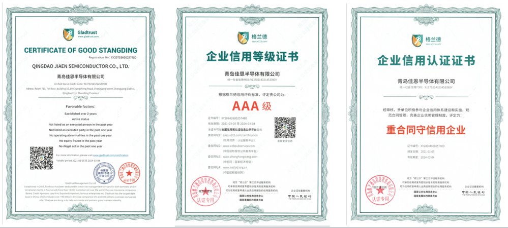 2020年3月,經(jīng)過中國招標(biāo)投標(biāo)網(wǎng)、中國招標(biāo)投標(biāo)公共服務(wù)平臺(tái)、中宏網(wǎng)、第三方信用認(rèn)證機(jī)構(gòu)格蘭德信用評(píng)價(jià)認(rèn)證中心的嚴(yán)格審核,青島佳恩半導(dǎo)體有限公司榮獲"AAA級(jí)企業(yè)信用等級(jí)"證書,這標(biāo)志著青島佳恩半導(dǎo)體有限公司在規(guī)范運(yùn)營、誠信經(jīng)營上得到了國家相關(guān)部門及權(quán)威機(jī)構(gòu)的認(rèn)可。